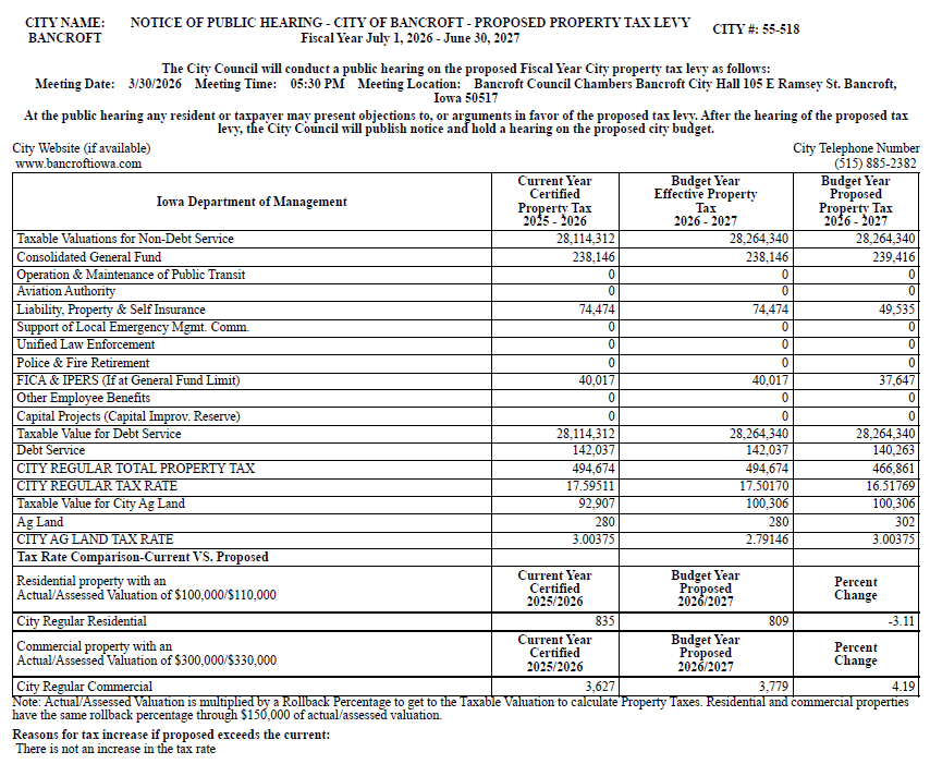 MEETING LOCATION: COUNCIL CHAMBERS - CITY HALL 105 E RAMSEY ST. BANCROFT, IA